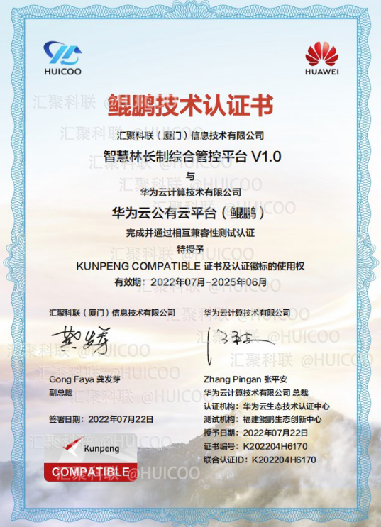 匯聚科聯(lián)自主研發(fā)的“智慧林長制綜合管控平臺1.0”與華為云計算技術(shù)有限公司的華為云公有云平臺(鯤鵬)完成并通過相互兼容性測試認證,正式獲得華為鯤鵬技術(shù)認證書